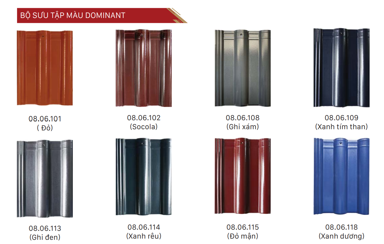 Ngoài màu đỏ đặc trưng của ngói truyền thống, Ngói Prime HERA còn có nhiều màu sắc đa dạng tùy thuộc theo sở thích của mỗi gia đình. Ưu điểm đặc biệt của ngói prime là bền màu vĩnh cửu, lớp men màu thấm sâu vào bề mặt ngói, giúp cho viên ngói có độ bền màu cao. Với công nghệ hiện đại, sóng hoàn toàn đáp ứng được các tiêu chuẩn như chống rêu mốc, chống bạc màu, tăng cường khả năng chống thấm. Màu sắc của ngói được tạo thành sau quá trình nung ở nhiệt độ cao, sau đó được phủ tráng men, đảm bảo cho ngói luôn giữ được màu sắc như ban đầu sau nhiều năm sử dụng.