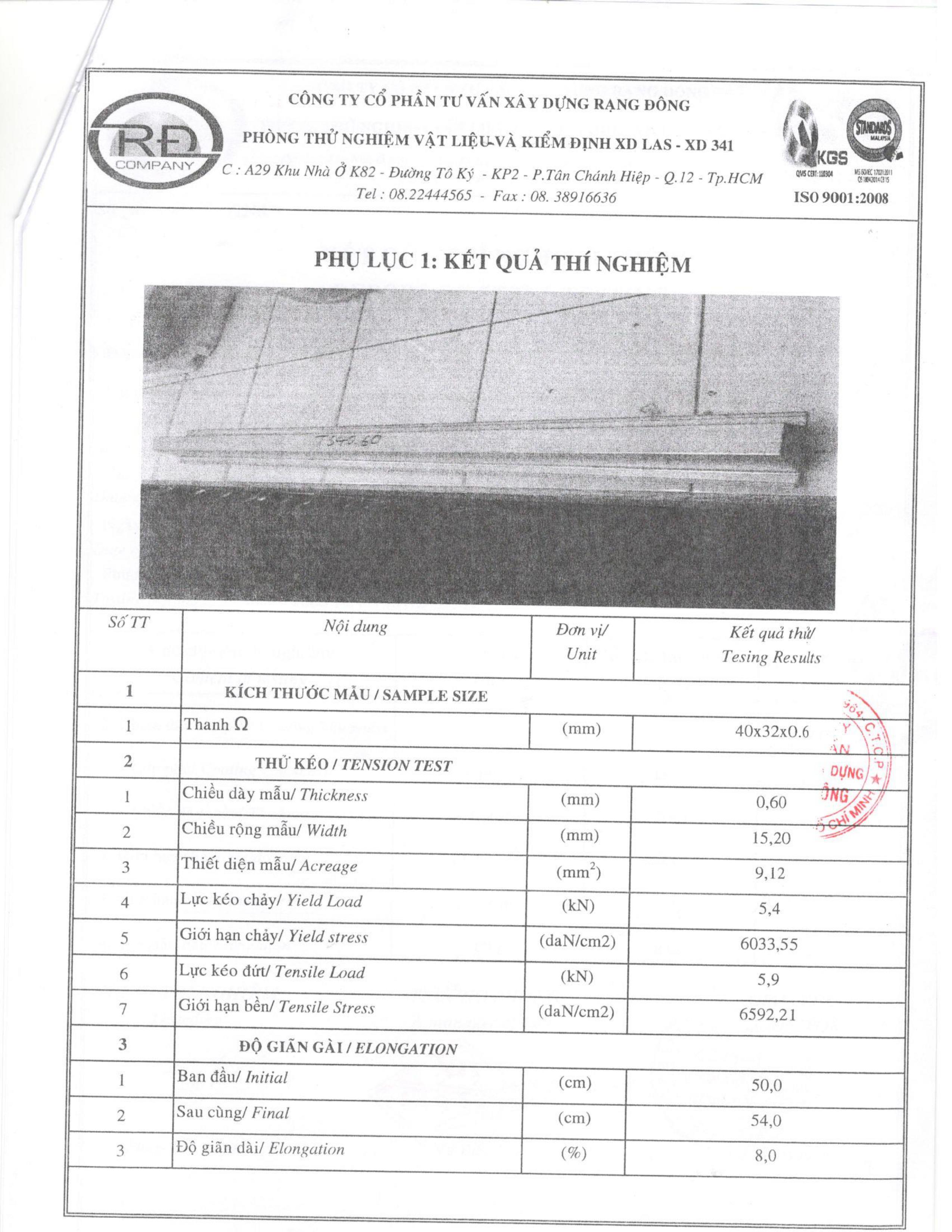 - Cường độ chảy tối thiểu: 550 Mpa- Độ dày lớp mạ : 100g/m2 đối với TS40.60 màu trắng, 150g/m2 đối với cầu phong TS40.60 màu xanh, 200g/m2 đối với TS40.60 màu đồng.