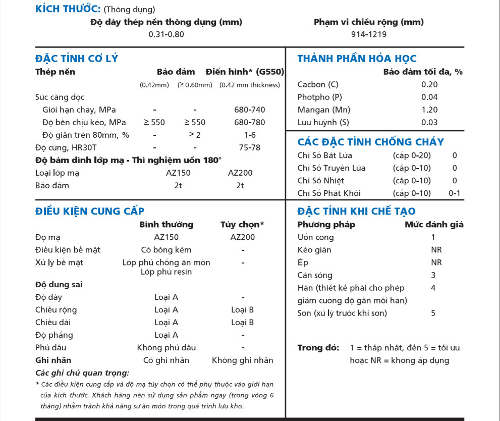 - Lớp mạ 55% nhôm kẽm AZ100 (100g/m2).