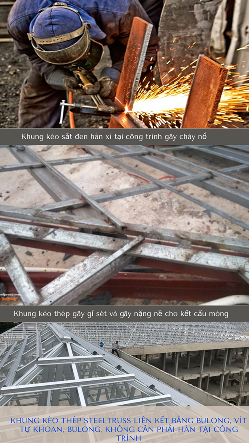√ Thi công nhanh chóng, đám bảo an toàn lao động: Trong khi sắt đen phần lớn các nhà thầu thường tính toán dựa theo kinh nghiệm cá nhân và được hàn xì tại công trình gây lãng hí nếu tính thừa và gây cháy nổ nếu không đảm bảo được an toàn lao động. Hoặc thép hộp cũng có nhược điểm tương tự khi phải bảo dưỡng đinh kỳ và gây nặng nề ảnh hưởng đến hệ thống dầm móng. Trong khi thanh mè/lito dùng trong hệ thống KHUNG KÈO THÉP CHO MÁI NHÀ CỦA STEELTRUSS® lại chỉ được liên kết thành 1 hệ thống bằng ốc vít tự khoan, blong, bản mã, bat L , dẫn đến thi công nhanh chóng. Tất cả đều đều được tính toán thiết kế bằng phần mềm chuyên dụng trước khi sản xuất nên giảm thiểu được vật liệu thừa khi thi công tại công trình gần như tuyệt đối.